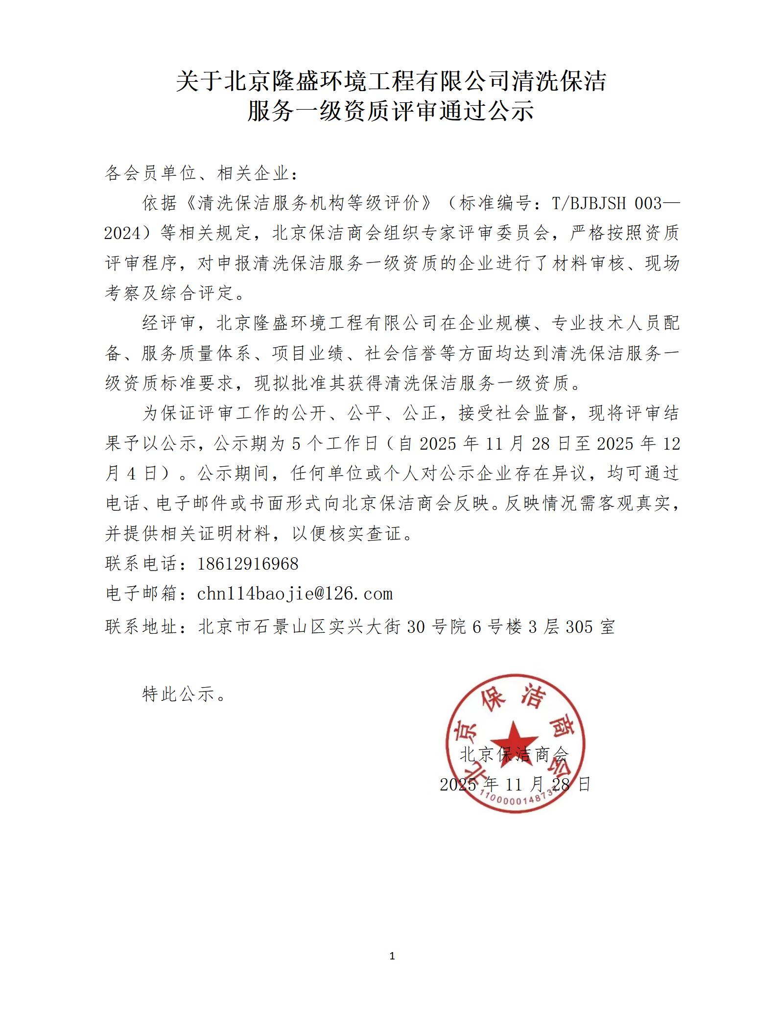 关于北京隆盛环境工程有限公司清洗保洁 服务一级资质评审通过公示